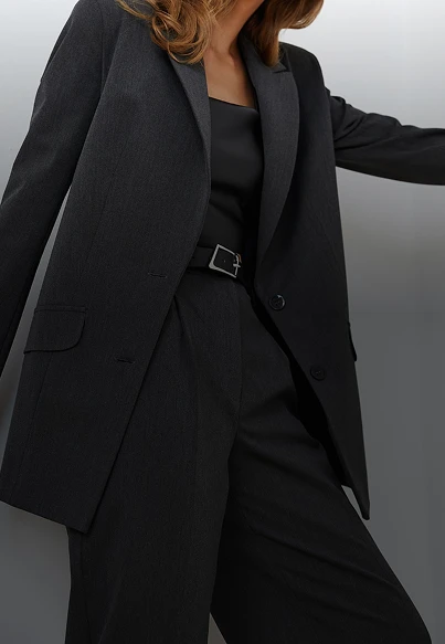 Klassischer Damenanzug aus Wollmischgewebe mit Seidenanteil. Einreihige Jacke und Hose mit mittlerer Passform. Der Stoff ist formstabil, knitterfrei und hat eine matte Textur. Geeignet sowohl für das Büro als auch für festliche Anlässe. Erhältlich in Schwarz, Graphit und Braun.