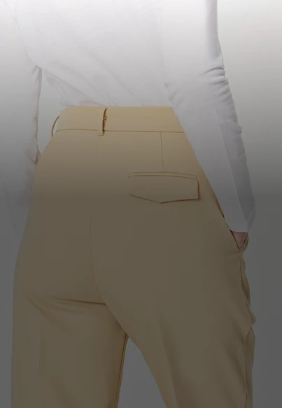Gerade geschnittene Hose mit hoher Taille. Elastischer Bund ohne Riemen, dezente Falte vorne, saubere Nahtlinie. Sie passt hervorragend zu verschiedenen Outfits, sowohl zu Blusen als auch beispielsweise zu locker geschnittenen Pullovern.