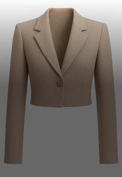 Kurze Jacke aus strukturierter Wolle. Mit geometrischer Schulterlinie und enger Passform. Kann gut einzeln oder als Teil eines Kostüms getragen werden.