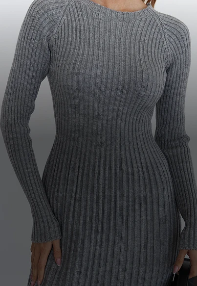 Weiches Strickkleid aus Wollgarn. Ohne Verschlüsse, mit kleinem Ausschnitt und langen Ärmeln. Passt sich leicht an verschiedene Stile an – vom Büro- bis zum Freizeitlook.