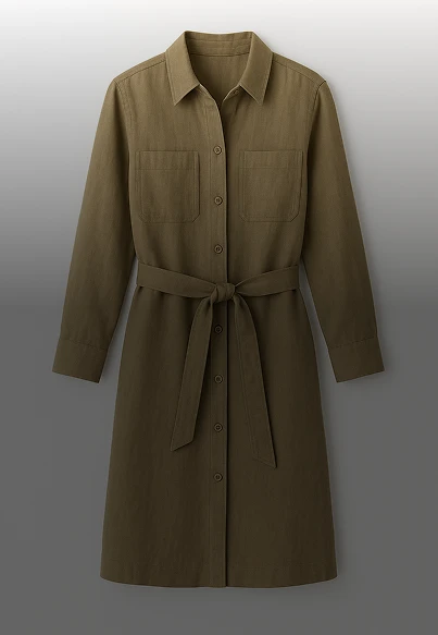Funktionales Modell aus einer Mischung aus Baumwolle und Leinen. Kann als Kleid oder als Überzieher über einem leichten Oberteil getragen werden. Mit einem Gürtel aus dem gleichen Stoff und minimalistischen Details.
